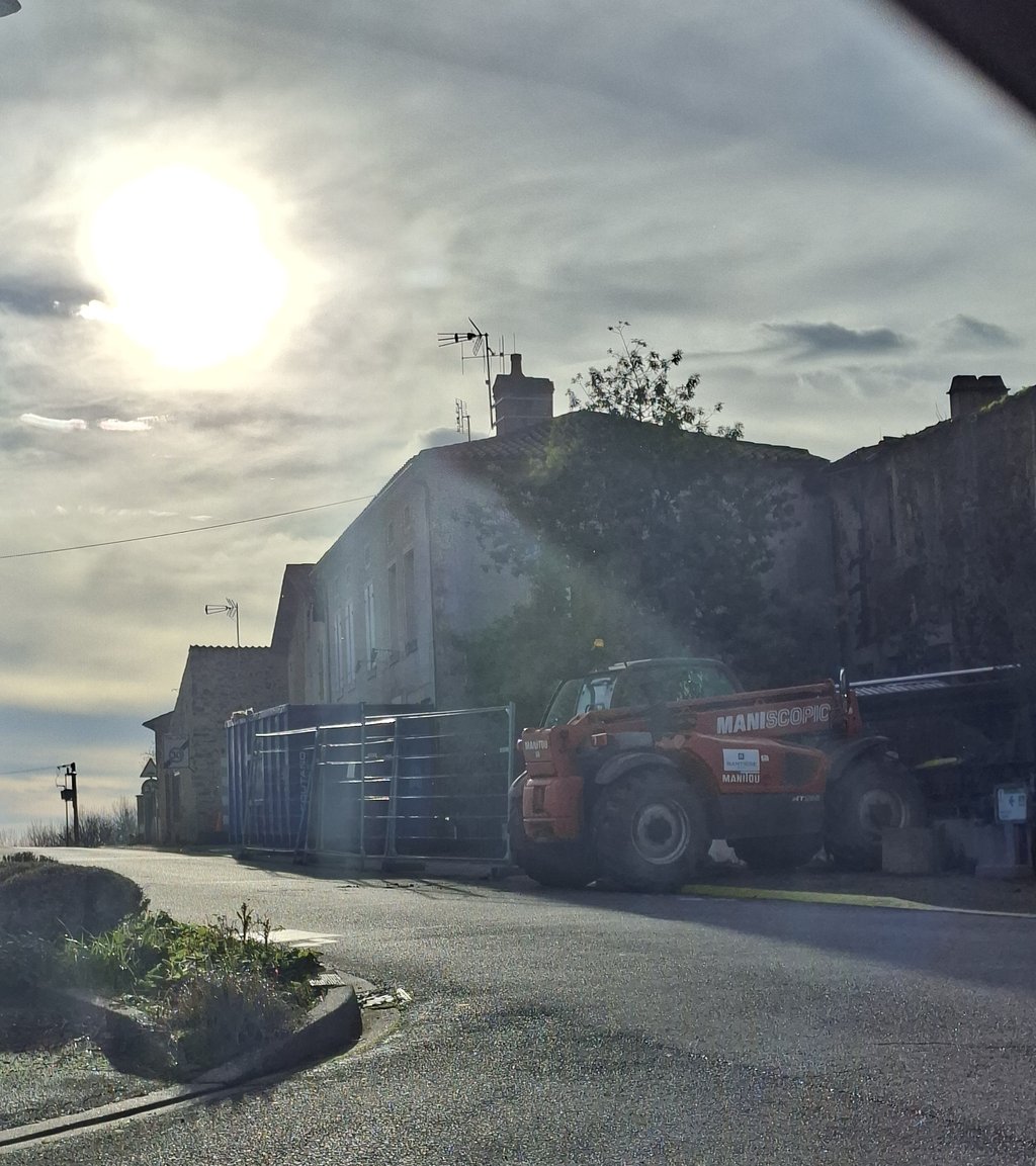 Si vous êtes passé dans le centre bourg, vous avez pu constater l'installation d'une benne sur le trottoir au niveau de l'immeuble incendié, d'une grue et de divers engins de chantier à l'arrière du bâtiment sur le terrain privé de la co-propriété.