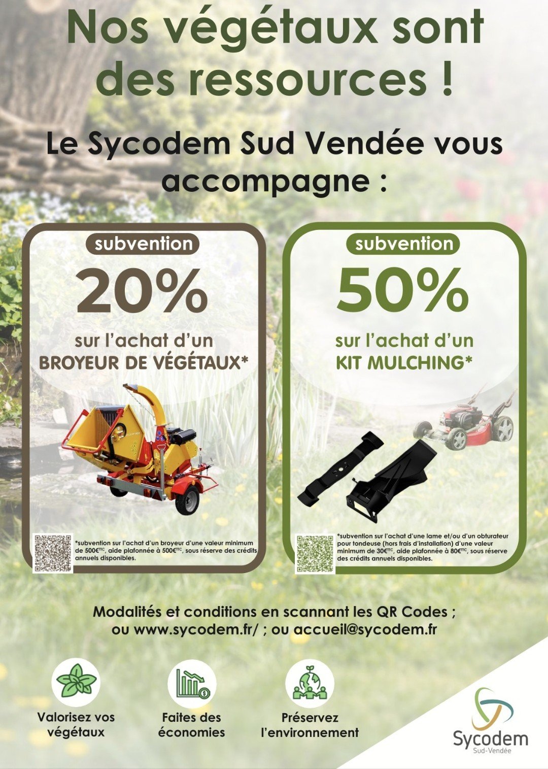 Dans le cadre de son accompagnement à de nouveaux gestes de valorisation des végétaux, le Sycodem apporte aux particuliers une subvention de 20% sur le coût d'achat d'un broyeur de végétaux ; et de 50% sur le coût d'achat d'un kit mulching.