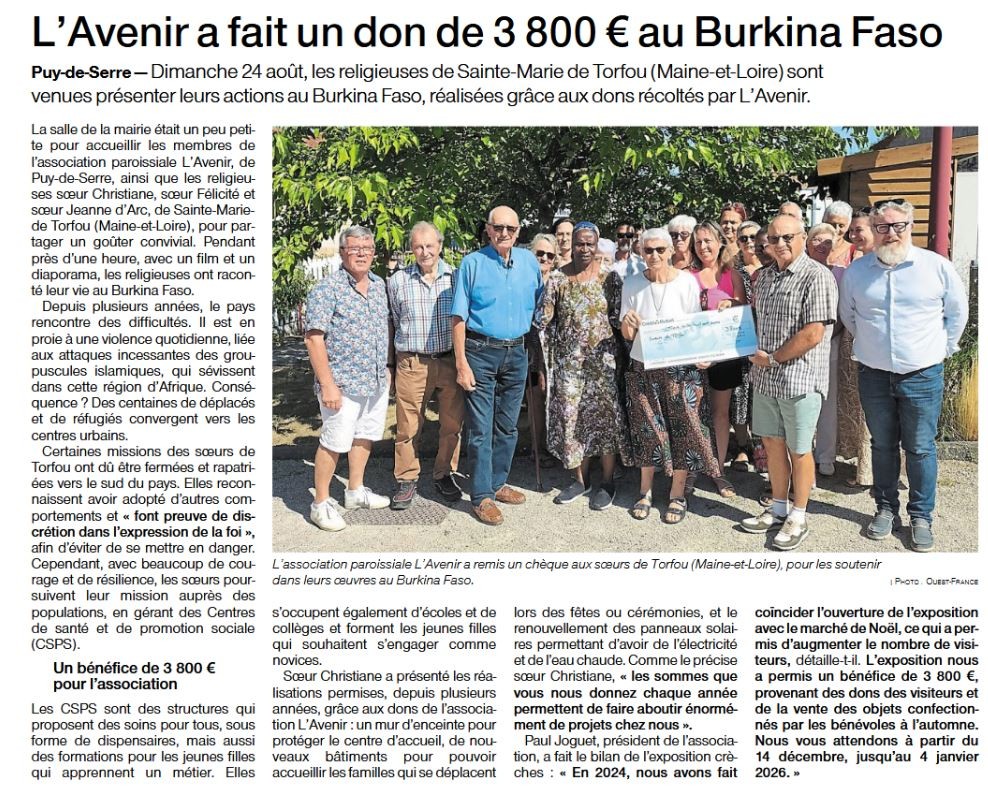 29 Août 2025 L'Avenir fait un don de 3800 € au Burkina-Faso