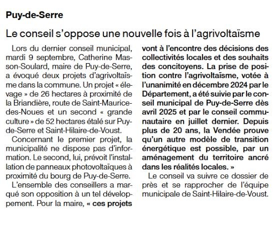 16 Septembre 2025 Le conseil s'oppose une nouvelle fois à l'agriphotovoltaïsme